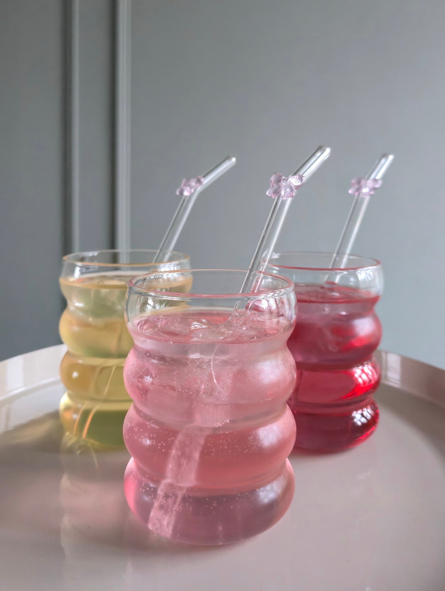 Luxe Handgeblazen Drinkglazen Set Gegolfd Cirkelvormig 4 x 350ml met Herbruikbare Rietjes